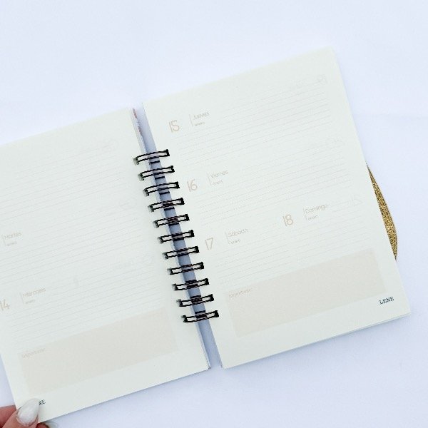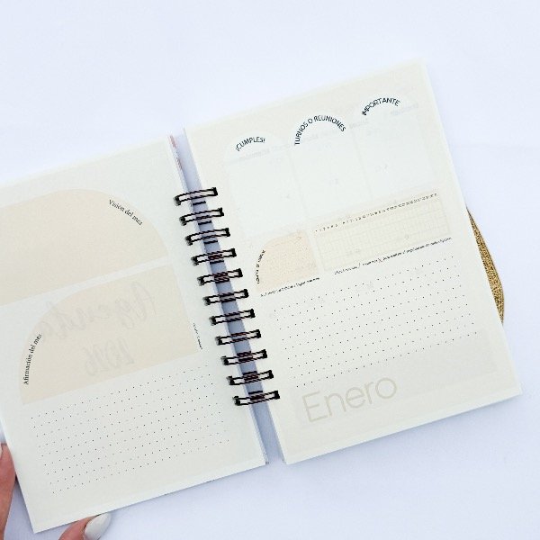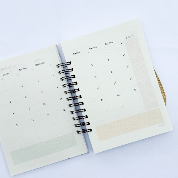Hecha con materiales de alta calidad y encuadernación artesanal, esta agenda es una herramienta para organizarte, inspirarte y crear un 2026 en equilibrio.
